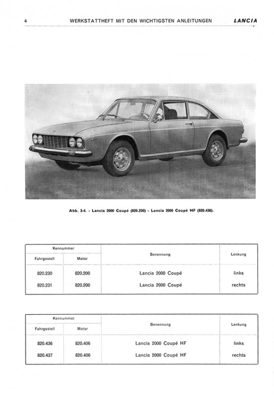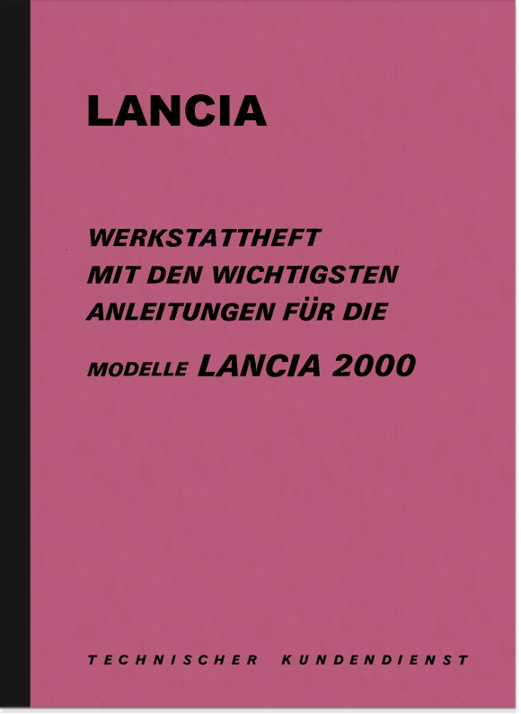 Reparaturanleitung für Lancia Modelle 2000 Limousine mit (820.416/417) und ohne (820.210/211) Einspritzmotor, Coupé (820.230/231) und Coupé HF (820.436/437). Ausgabe 1973, in deutsch.