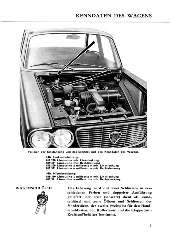 Bedienungsanleitung für Lancia Flavia, Flavia milleotto und Flavia Iniezione, 1800 ccm/ 80PS/92PS + 102 PS (Benzin-Einspritzmotor) mit Lenkrad- und Mittelschaltung sowie Rechts- und Linkslenkung, in deutsch mit Schaltplan der Elektrik.
