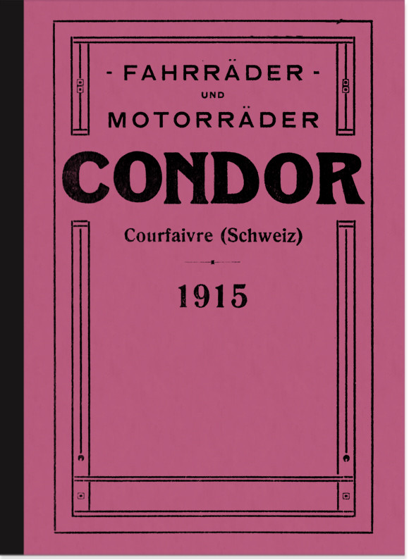Broschüre über Condor Fahrräder und Motorräder. Abgebildet und beschrieben sind Fahrräder, Motorräder und Seitenwagen. Enthalten sind Touren-, Renn-, Geschäfts- und Militär-Fahrräder, 1-und 2-Zylinder Motorräder mit 2,25/2,5/3,5 und 4 PS. Ausgabe 1915, in deutsch.