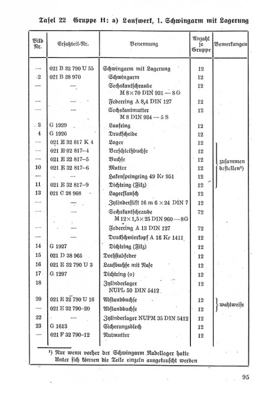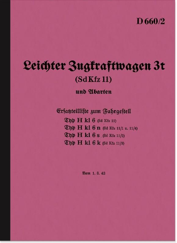 Ersatzteilliste zum Fahrgestell für "Mittlerer Zugkraftwagen 3 t", Sonder-Kfz. 11, Typ H kl 6 (Sd.Kfz 11), H kl 6n (Sd Kfz 11/1 u. 11/4), H kl 6s (Sd Kfz 11/2), H kl r k (Sd Kfz 11/3). Ausgabe August 1943. Dienstvorschrift D 660/2.