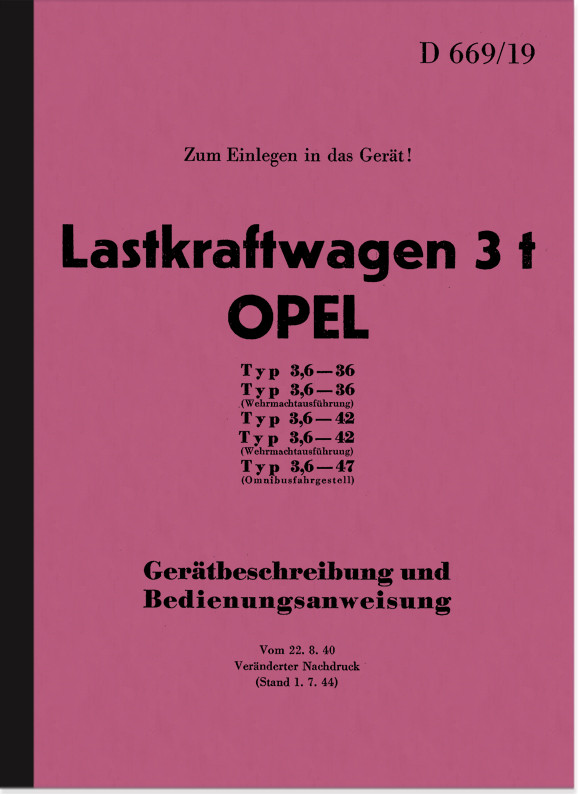 Bedienungsanleitung und Gerätbeschreibung für Opel 3 t. Lastkraftwagen Typ 3,6 (36/42/47). Ausgabe 22.8.1940 (Stand 1.7.1944), in deutsch. Wehrmacht, Dienstvorschrift D 669/19.
