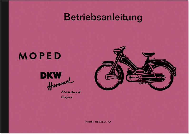 Bedienungsanleitung für DKW Hummel Standard und Super mit Rahmentank, 0,8 PS/ 1,35 PS und 1,8 PS (2 PS) inkl. Exportmodelle, ab Fgst.-Nr. 01 551 101. Ausgabe 1957/1958. Inklusive Schaltpläne.
