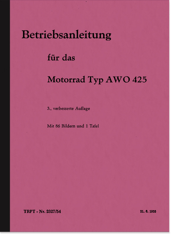 Bedienungsanleitung mit Reparaturanweisungen für AWO 425, 250 ccm, 1-Zylinder 4-Takt, 12 PS Tourenmodell. Ausgabe 1955, in deutsch.