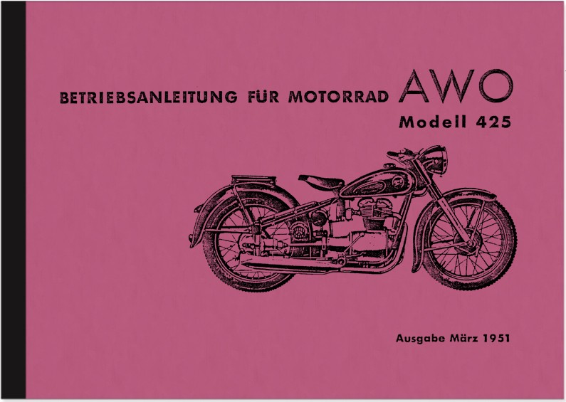 Bedienungsanleitung für AWO 425, 1-Zylinder 4-Takt, 250 ccm, 12 PS, (ähnlich BMW), Tourenmodell. Ausgabe März 1951.