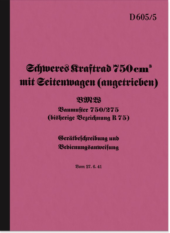 Bedienungsanleitung für BMW R 75 WH Motorrad, einschließlich Seitenwagen. Ausgabe 6/1941. WH-Nr. D 605/5.