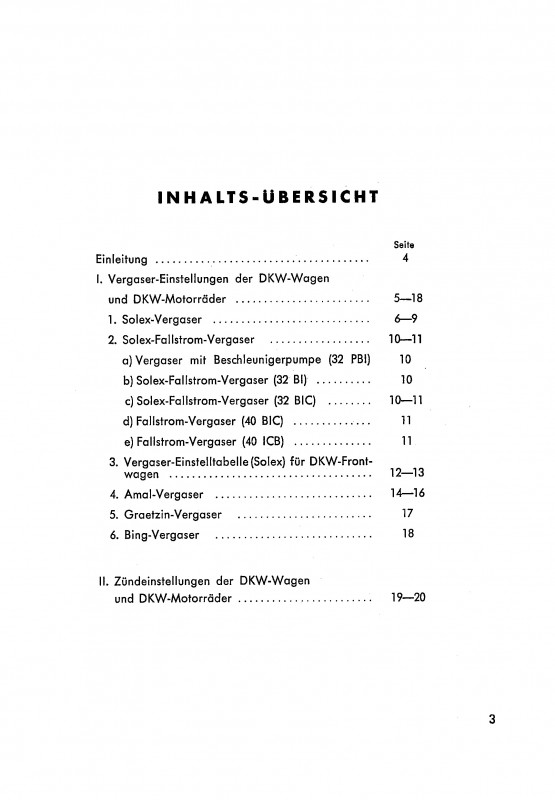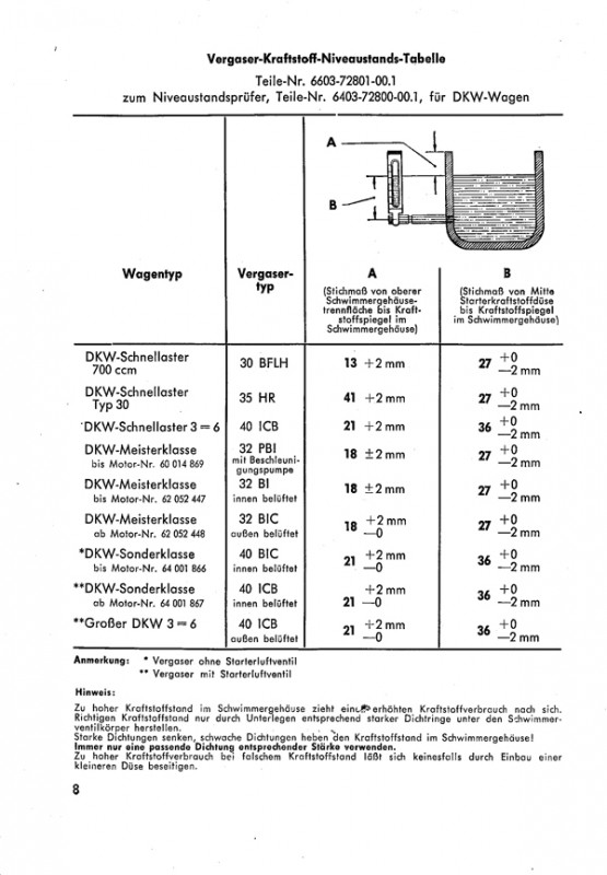 I. Vergaser-Einstellungen der DKW-Wagen und DKW-Motorräder
