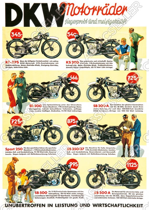 DKW Motorrad Modelle 1937 Vorkrieg RT 3 PS KS SB 200 250 350 500 A Poster Plakat Bild