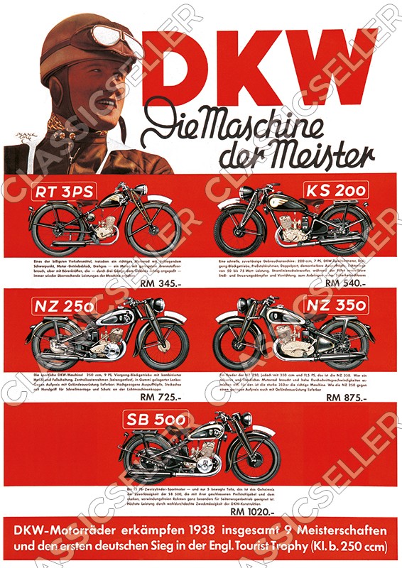 DKW Motorrad Modelle 1938/1939 Vorkrieg RT 3 PS KS 200 NZ 250 350 SB 500 Poster Plakat Bild