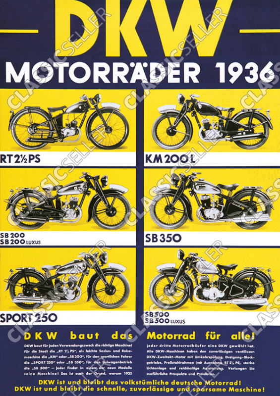 DKW "Motorräder 1936" RT 2,5 PS SB 200 350 500 Luxus 250 Sport KM 200 L Poster Plakat Bild