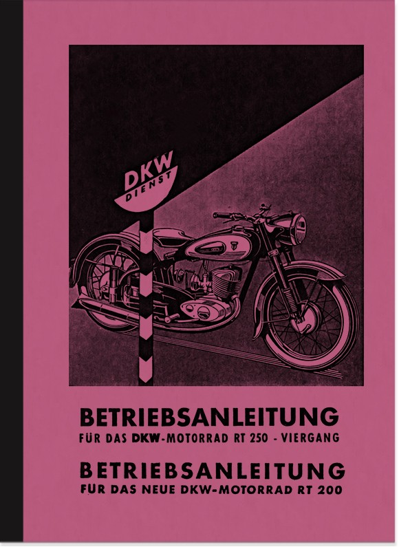Bedienungsanleitung für DKW RT 200 3-Gang ohne Hinterradfederung, RT 250 mit Seitenwagen 4-Gang Getriebe mit Hinter- radfederung und Hella-, Bosch- oder Notek- Scheinwerfer, Halb- und Vollnaben- Bremsen.