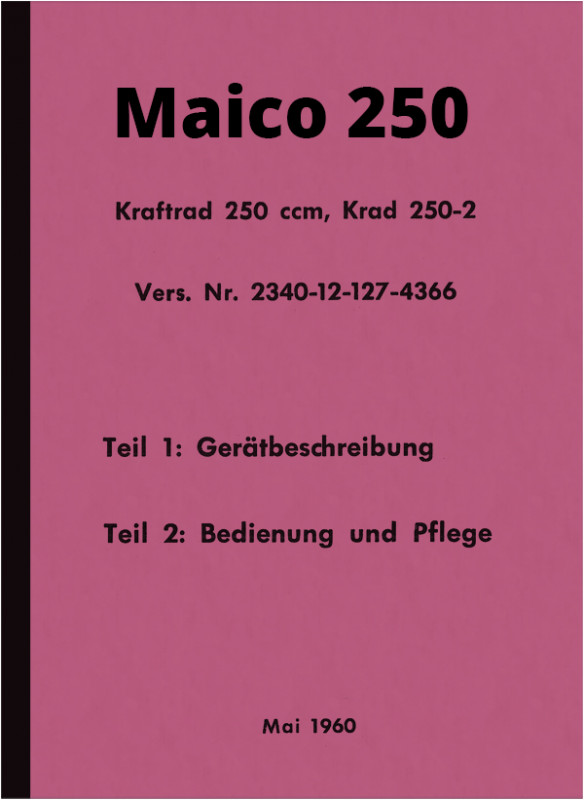 Bedienungsanleitung (Gerätebeschreibung, Bedienung und Pflege) für Maico M 250-2 Bundeswehr Krad. TDv 2340/1-10 (2340/001-12). Ausgabe Mai 1960, in deutsch.