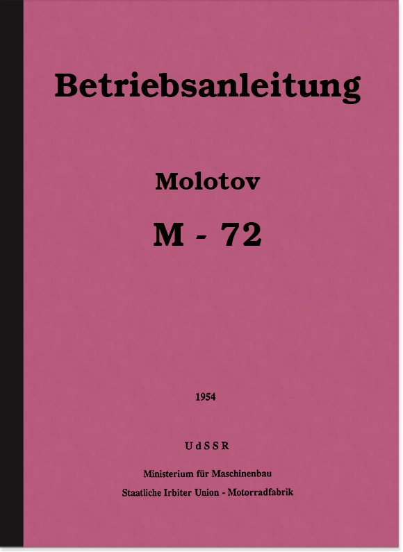 Bedienungsanleitung mit allen technischen Daten und Reparatur-/Wartungsanleitung für Ural Dnepr Molotov M 72 Gespann (750 ccm/ 22 PS, 2-Zylinder, 4- Takt-Motor). Ausgabe 1954 in deutsch.