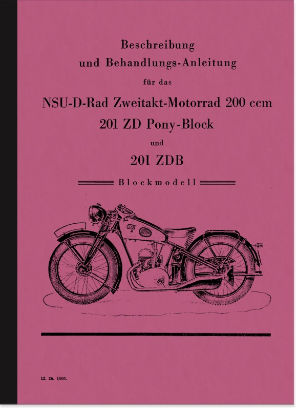 Bedienungsanleitung für NSU 201 ZDB und NSU-D-RAD Modell 201 ZD Pony Block (Zweitakt Blockmotor mit Nasenkolben). Ausgabe 12/1936 für Modelle 1936/37 in deutsch.