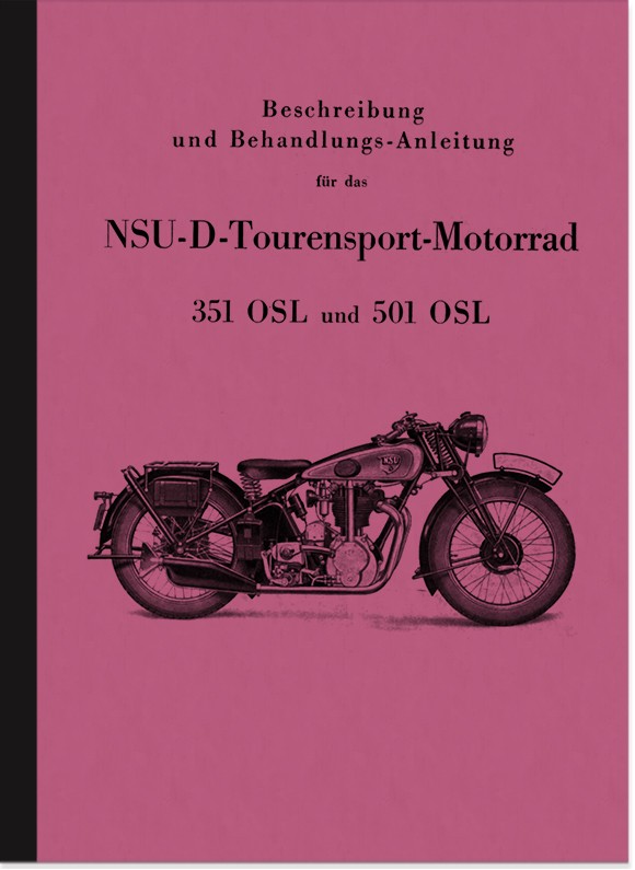 Bedienungsanleitung für NSU-D (NSU/D-Rad) 351 OSL und 501 OSL Tourensport-Motorrad, mit Gußzylinderkopf und Haarnadelventile. Ausgabe April 1937.