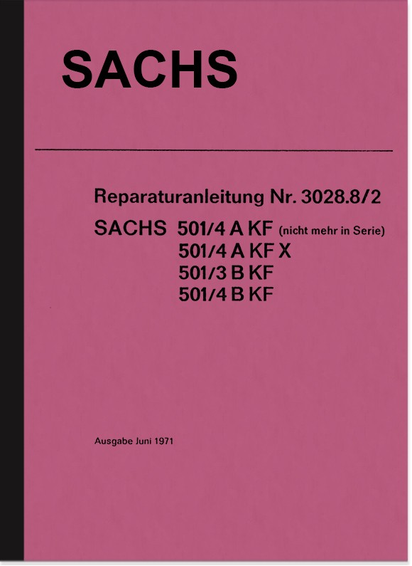 Reparaturanleitung für Sachs 50 ccm, 2,5 und 2,9 PS 4-Gang-Fußschaltung, Fahrtwindgekühlt und 2,9 PS (2,1 Kw) 3-Gang- Fußschaltung, Fahrtwindgekühlt, Typen: 501/4 AKF, 501/4 AKFX, 501/3 BKF und 501/4 BKF. Ausgabe 6/1971, in deutsch.