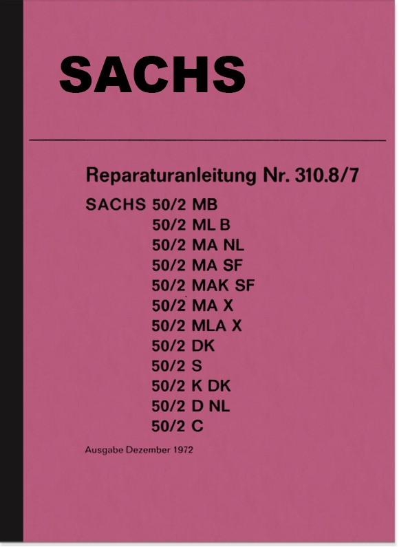 Reparaturanleitung für 50/2 MB, 50/2 ML B, 50/2 MA NL, 50/2 MA SF, 50/2 MAK SF, 50/2 MA X, 50/2 MLA X, 50/2 DK, 50/2 S, 50/2 K DK, 50/2 D NL, 50/2 C. 2-Gang-Handschaltung, Fahrtwind- und Gebläsekühlung mit Tretkurbel und Kickstarter, mit 1 PS/ 1,5 PS/ 1,8 PS/ 2,4 PS und 2,6 PS (Sachs-Nr.: 310.8/7). Ausgabe Dezember 1972, in deutsch.