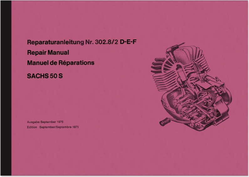 Reparaturanleitung für Sachs 50 S 1, 2 und 3 Ausführung mit Grauguss und Aluzylinder 4,5/5,3/6,25 PS. Ausgabe September 1975, in deutsch, englisch und französisch.