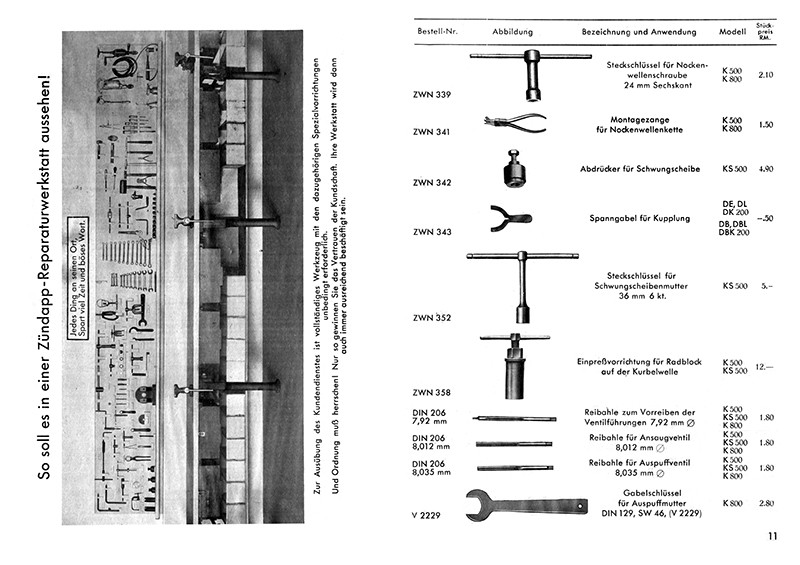 Zündapp Anleitung Liste Handbuch Spezial-Werkzeuge K 350 500 800 KS Derby DB DL KK DBK DBL DE