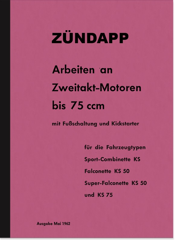 Arbeiten an 2-Takt-Motoren (Reparaturanleitung) 50/75 ccm mit Fußschaltung und Kickstarter für folgende Typen: Sport-Combinette KS, Falconette KS 50, Super-Falconette KS 50, KS 75, Motor Typ 276, Ausgabe 5/1962. Die Anleitung gilt sinngemäß auch für alle anderen 3- und 4-Gang Zündapp Motoren mit Fußschaltung ab 1961.