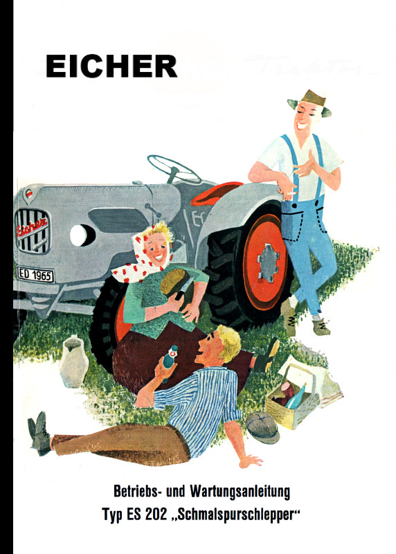 Bedienungsanleitung und Wartungsanleitung mit farbigem Cover für Eicher Schmalspurschlepper Typ ES 202. Ausgabe 1966, in deutsch.