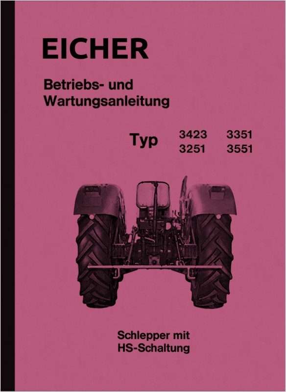Bedienungs- und Wartungsanleitung für die Eicher Schleppertypen 3251, 3423, 3351 und 3551, mit HS-Schaltung. Inklusive Schaltplan. Ausgabe Mai 1972, in deutsch.