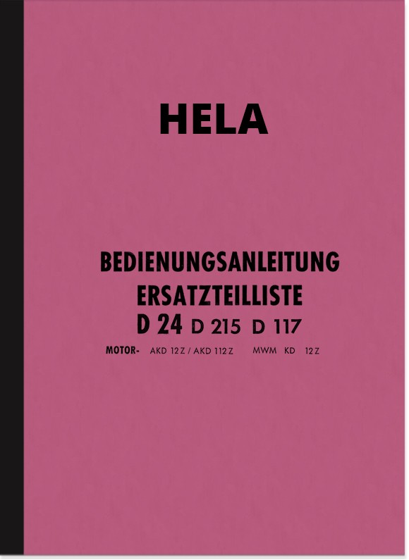 Kombinierte Bedienungsanleitung und Ersatzteilliste für die Hela Schleppertypen D24, D 215 und D 117 mit MWM-Motoren AKD 12 Z/AKD 112 Z und KD 12 Z. Ausgabe etwa 1959, in deutsch.