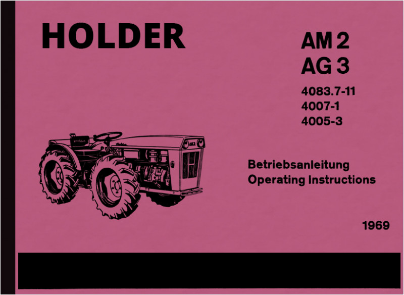 Bedienungsanleitung für Holder AM 2 mit Motor HD 2 (20 PS) und AG 3 mit Motor HD 3 (30 PS), inkl. Dreipunkt-geräteaushebung 4001-3, Anbauvorrichtung für Normdreipunkt- geräte 4001-7, Bodenbearbeitungsgeräte Hackfräse 4083.7-11, Zweischarpflug 4007-1, Gerätetragrahmen 4005-3, Pflanzlochbohrer Klein. Ausgabe 1969, in deutsch und englisch.